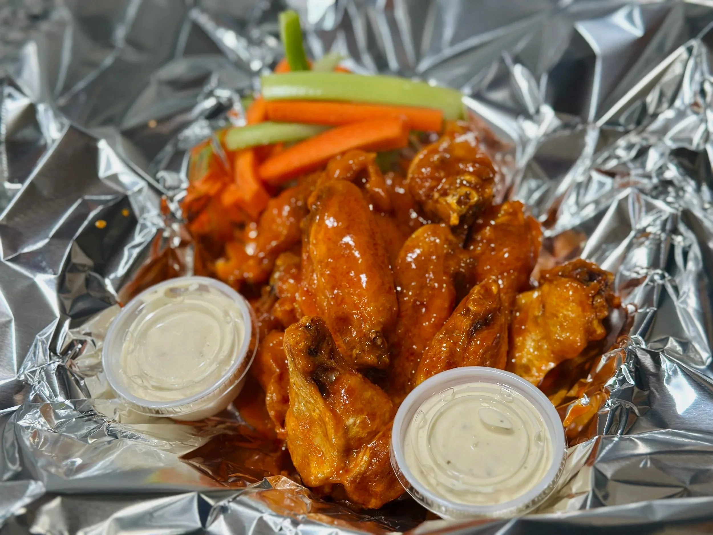 Your choice of sauce: Mild, Medium, Hot, WOW, BBQ, Honey BBQ, Spicy BBQ, or Garlic BBQ. Served with Ranch dressing, celery & carrots. Your choice of Bone-In or Boneless Chicken Wings. Extra Ranch dressing, celery & carrots $1.50.