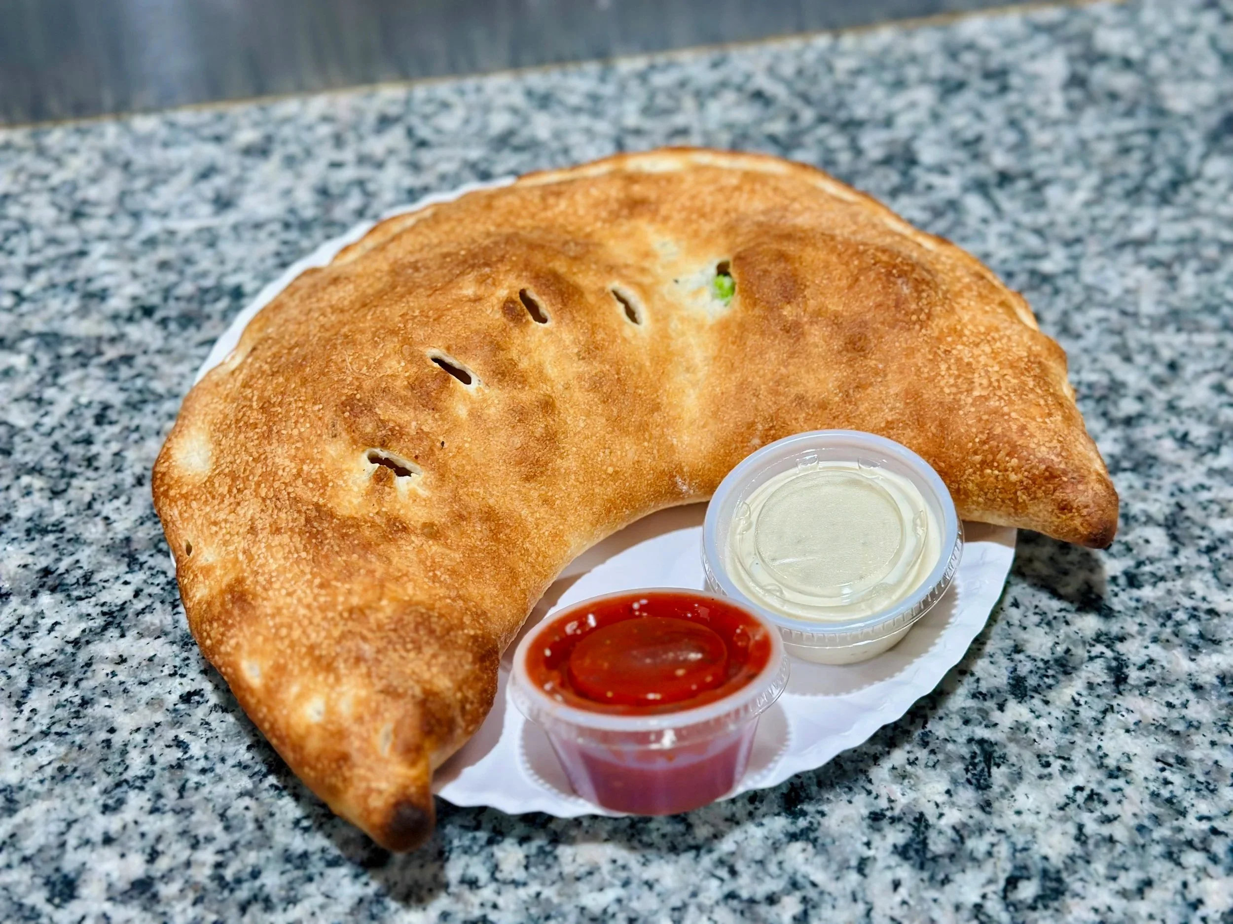 Ricotta, sun dried tomatoes, garlic, mozzarella cheese, topped with lightly drizzled red sauce, pesto, and fresh basil